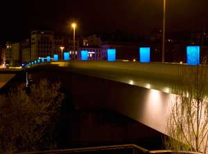 Ce doit être une des premières fois que ce pont est illuminé. Mais… étant donné son exiguïté pour les piétons (trottoirs riquiqui alors que 3 voies pour les voitures), cela a dû être un vrai défi pour Yves Moreaux et Jean Reydellet. Et comme toute contrainte en création est profitable, nous attendons le résultat avec curiosité. Ils ont imaginé des espèces de lumignons géants placés à hauteur de parapet. Ces lumignons luiront selon des variations mystérieuses et douces selon que vous vous en approcherez, les toucherez.